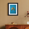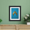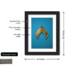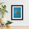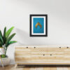 Black textured framed painting, with artwork protected by thick laminated coating with hinging hook on the back.
