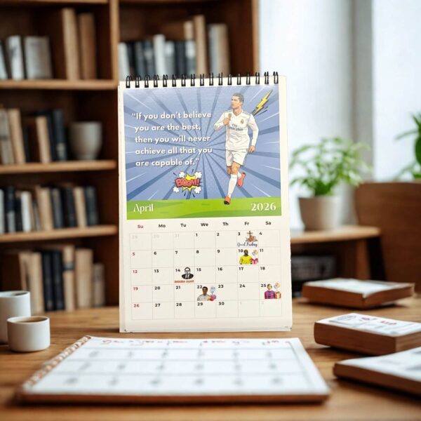 Bring your love for football to your workspace or study! This vibrant 2026 Ronaldo Calendar features dynamic, artistic illustrations Cristiano Ronaldo, making it an inspiring addition to any desk or bookshelf.