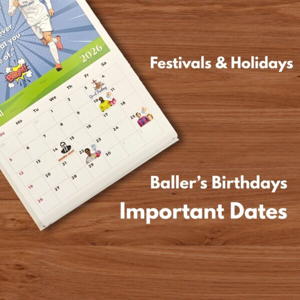 Stunning cover with artwork of Cristiano Ronaldo​, covers all months with major football players birthdays and holiday events. Perfect for Gifting for football fans, sports lovers, colleagues, and students.
