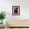Black textured framed painting, with artwork protected by thick laminated coating with hinging hook on the back.