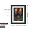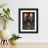 Black textured framed painting, with artwork protected by thick laminated coating with hinging hook on the back.