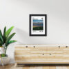 Black textured framed painting, with artwork protected by thick laminated coating with hinging hook on the back.