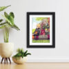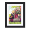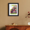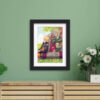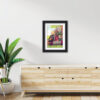 Black textured framed painting, with the artwork protected by thick laminated coating with a hanging hook on the back.