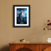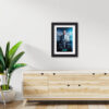 Black textured framed painting, with artwork protected by thick laminated coating with hinging hook on the back.