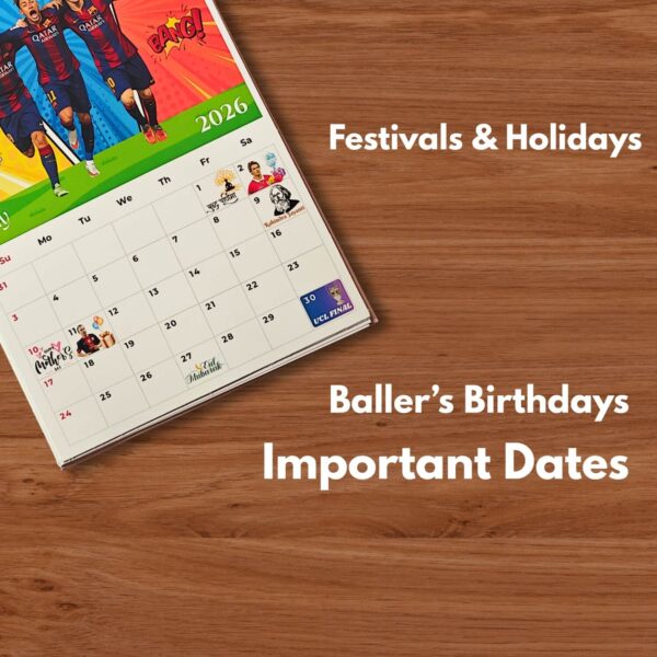 Stunning cover with artwork of iconic football stars from around the globe​, covers all months with major football players birthdays and holiday events. Perfect for Gifting for football fans, sports lovers, colleagues, and students.
