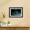 Black textured framed painting, with artwork protected by thick laminated coating with hinging hook on the back.