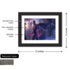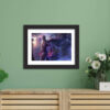 Black textured framed painting, with artwork protected by thick laminated coating with hinging hook on the back.