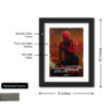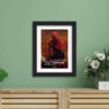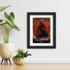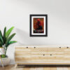 Black textured framed painting, with artwork protected by thick laminated coating with hinging hook on the back.